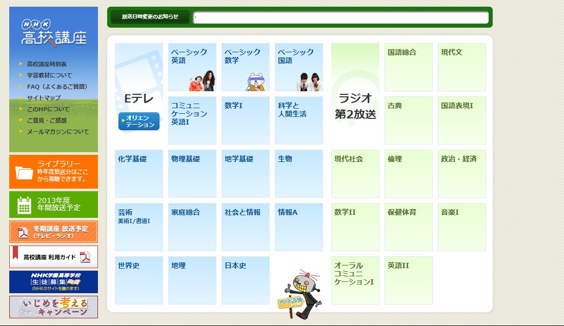 2013/12/11 Category : 勉強方法 テレビやラジオの放送だけじゃない!NHK高校講座の無料ネット配信を活用しよう 皆さん、一度くらいはNHK高校講座(あるいはNHKの教育番組)を見たことがあるのではないでしょうか?「さすが!」というべきか、NHKの番組は非常に分かりやすく、そのクオリティも高いです。また、高校の学習内容は余すところなく網羅しています。英語・数学・生物、それから情報やなんと書道(!)に至るまで。現在では、実際の授業の中でNHK高校講座のビデオを見せる、ということも少なくありません。特にビジュアル化した方が理解しやすい生物や化学の授業の中で活用されることが多いですね。しかし!それらの動画が無料でネット配信されてることはあまり知られていません。皆さん、家庭学習や電車通学中などヒマな時間があれば一度はNHK高校講座のHPをちょっとのぞいてみましょう。 (↑ 2013.12.11現在のHP)動画やラジオの配信(こちらも無料で聴けます)へのリンクがたくさん設けてありますね。電車通学の時などは、特にこのラジオの方がオススメです。音声だけなので他の邪魔にならず、自由に聞くことができます。NHKなのだから、さぞお堅い内容で真面目な顔をしたタレントが延々と喋っているのだろう、と思う方がいらっしゃるかもしれませんが、いえいえ、そんなことはありませんでした。非常に明るい雰囲気で、楽しく分かりやすいイラストなどを混じえて解説してあります。気になる方は、NHK高校講座、ぜひ一度見てみて下さい。 PR Comment0 Comment Comment Form お名前name タイトルtitle メールアドレスmail address URLurl コメントcomment パスワードpassword